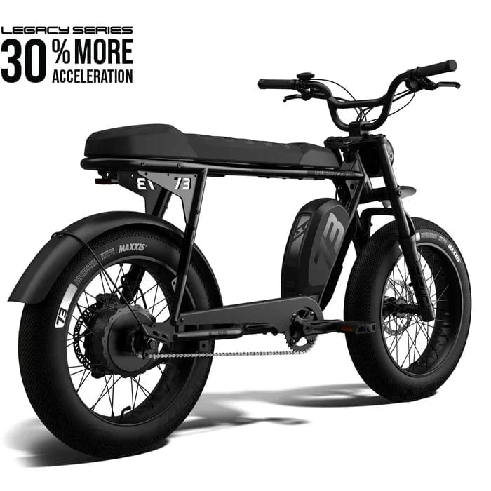 *Battery range estimates depend on conditions such as rider weight, speed, temperature, wind, tire pressure, terrain, incline, etc. Acceleration increases based on comparison to previous powertrains used in SUPER73 products. Acceleration increases may vary depending on rider weight, riding terrain, battery state of charge, weather, and other environmental factors. Mileage may vary. All bikes are subject to minor cosmetic changes.