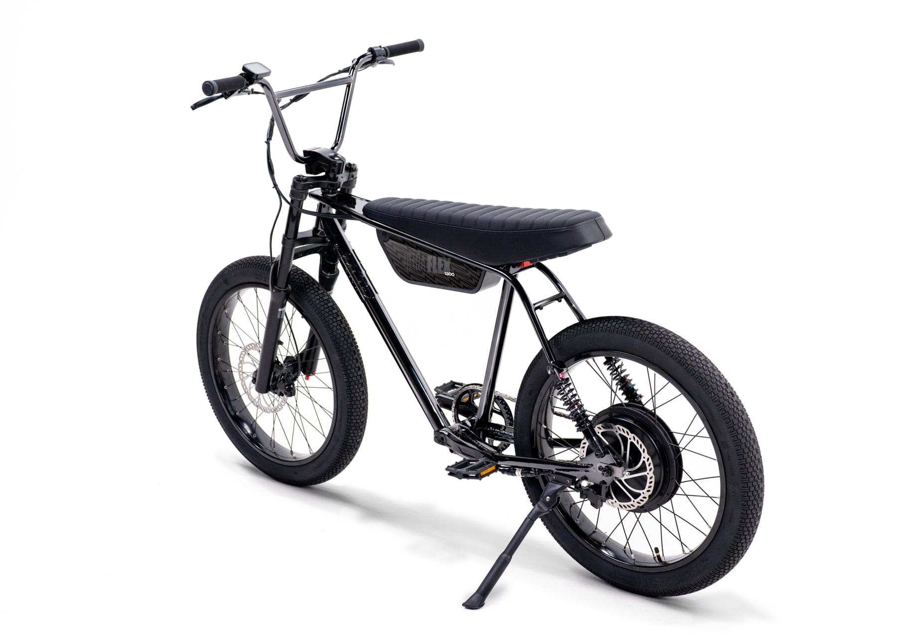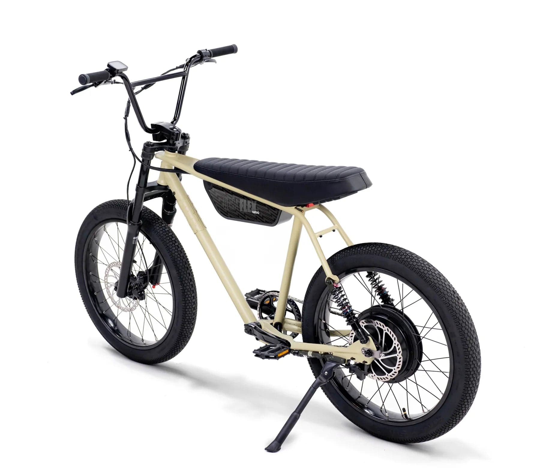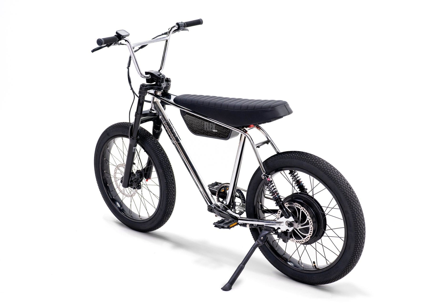 The Ultra Flex is our full-suspension big brother to the Ultra Urban, designed to smooth out bumps and handle jumps with ease. It features a 4130 Chromoly steel frame, sport-tunable front and rear suspension, and oversized puncture-resistant Sticky Sweet tires lined with aramid fiber. It’s perfect for taller riders with a 33.5" seat height, ideal for those between 5'7" and 6'5". The bike packs a powerful 750W Thrillmatic motor and a class-exceeding 25Ah battery, giving you a range of 30+ miles on throttle and up to 45+ miles with pedal assist. It’s all about delivering a thrilling, comfortable ride on and off the pavement.