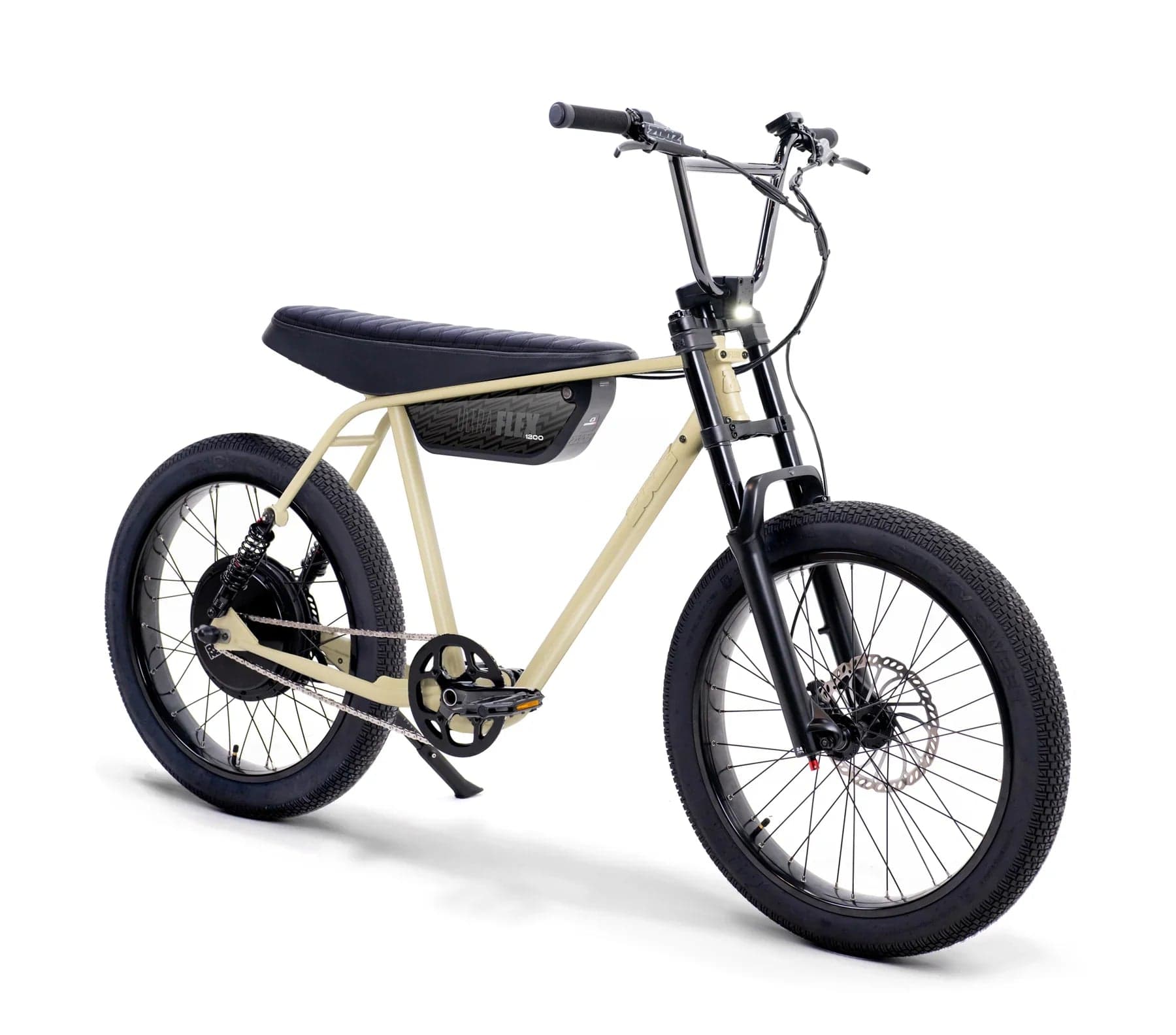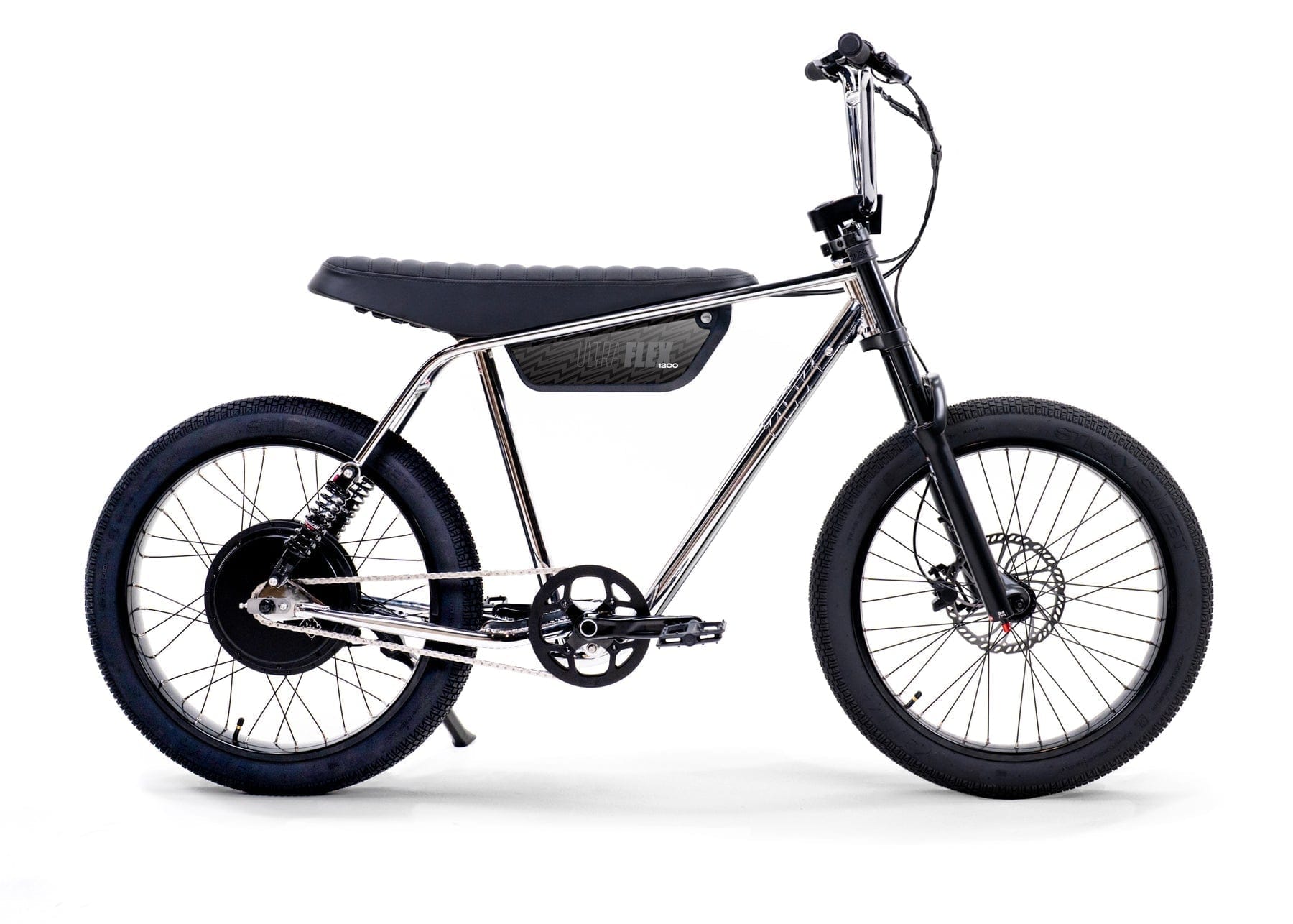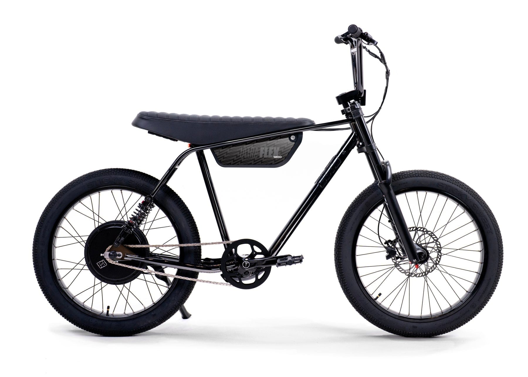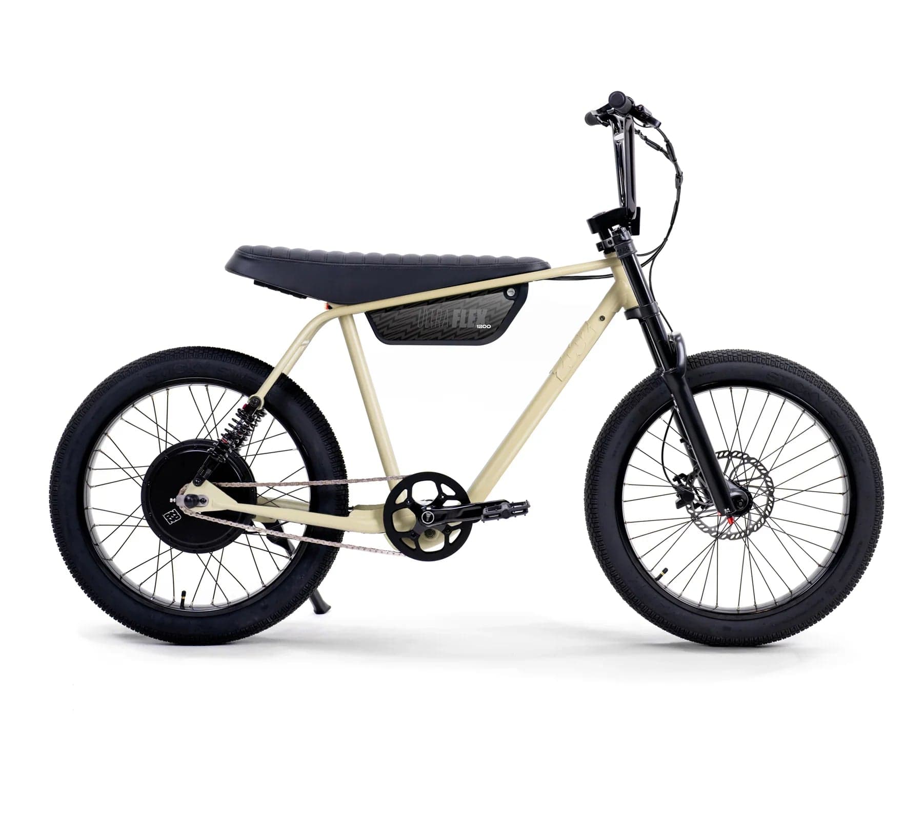 The Ultra Flex is our full-suspension big brother to the Ultra Urban, designed to smooth out bumps and handle jumps with ease. It features a 4130 Chromoly steel frame, sport-tunable front and rear suspension, and oversized puncture-resistant Sticky Sweet tires lined with aramid fiber. It’s perfect for taller riders with a 33.5" seat height, ideal for those between 5'7" and 6'5". The bike packs a powerful 750W Thrillmatic motor and a class-exceeding 25Ah battery, giving you a range of 30+ miles on throttle and up to 45+ miles with pedal assist. It’s all about delivering a thrilling, comfortable ride on and off the pavement.