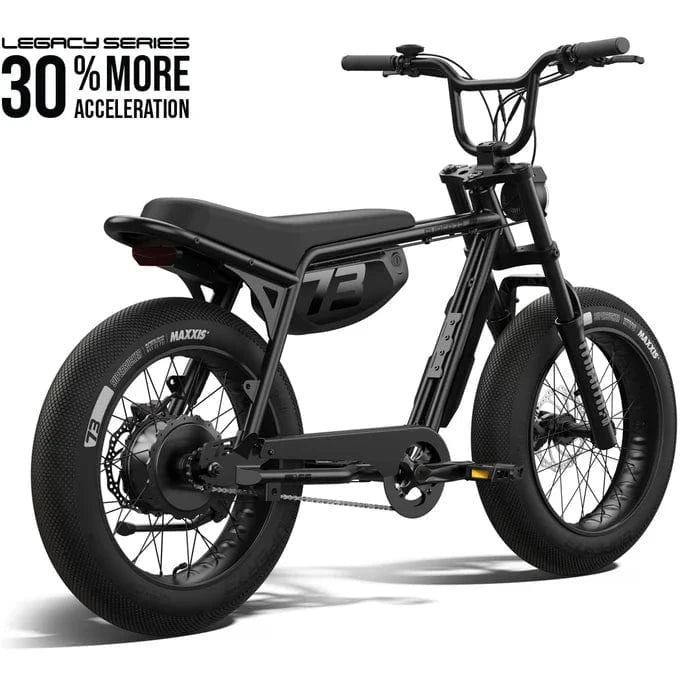 *Battery range estimates depend on conditions such as rider weight, speed, temperature, wind, tire pressure, terrain, incline, etc. Acceleration increases based on comparison to previous powertrains used in SUPER73 products. Acceleration increases may vary depending on rider weight, riding terrain, battery state of charge, weather, and other environmental factors. Mileage may vary. All bikes are subject to minor cosmetic changes.